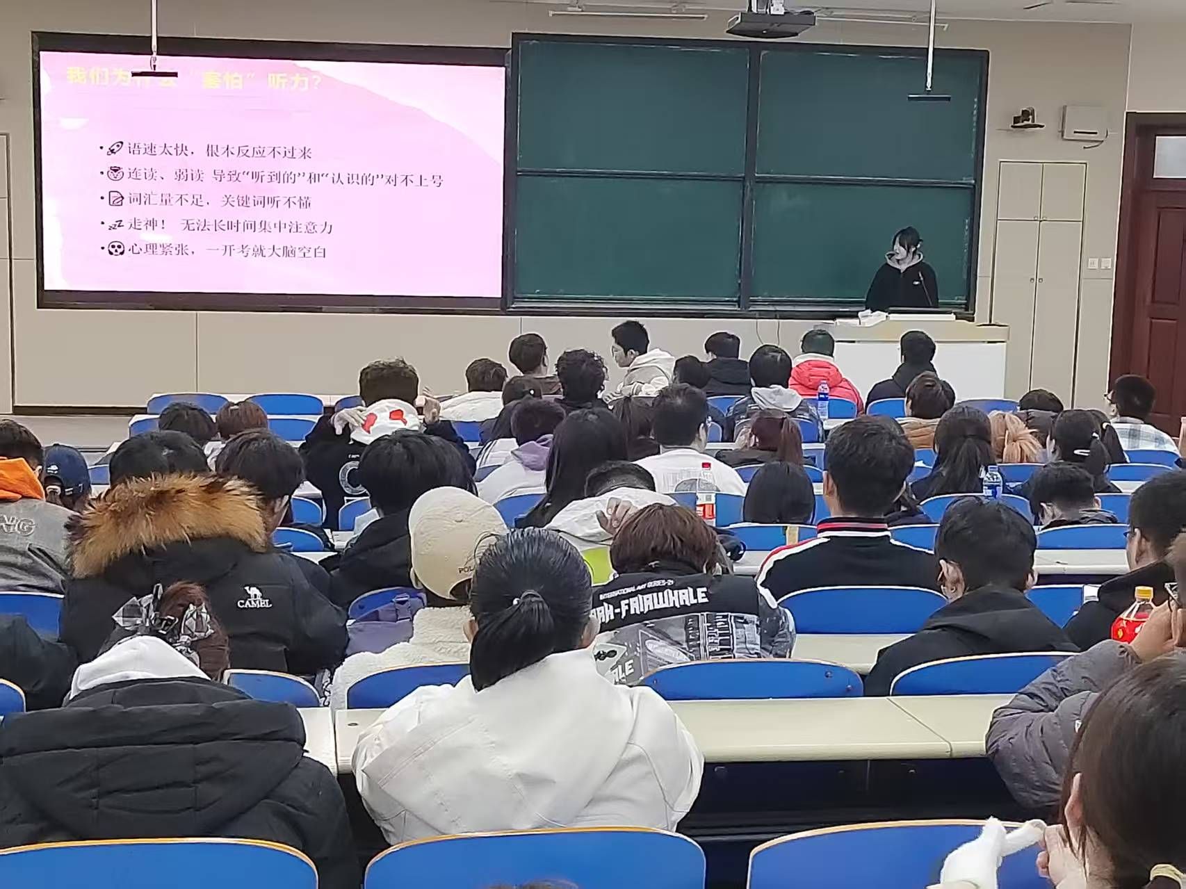 分享会上,分享嘉宾围绕写作、听力、阅读、翻译四大核心题型,深入剖析了四级考试的命题规律与评分标准。针对同学们普遍反映的听力理解困难、翻译表达中式化等问题,他们提出“精听与泛听相结合”、“话题词汇分类记忆”、“紧抓阅读理解关键词”等实用备考策略,帮助同学们精准定位备考重点;随后,每位分享者就个人备考经历,从复习计划的制定、学习资料的选择、时间管理的技巧等多个维度进行了详细讲解。